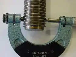 Мікрометричний гвинт пов'язаний з барабаном, який на конусному кінці має кругову шкалу з числом поділок n = 50. Враховуючи, що крок різьби гвинтової пари S = 0,5 мм, ціна поділки C кругової шкали (ноніуса) мікрометра дорівнює: