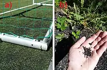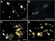 Нанопластик. Залежно від визначення, нанопластики мають розмір менше 1 мкм (тобто 1000 нм) або менше 100 нм[8]. Про існування нанопластів у навколишньому середовищі йде дискусія, оскільки виявлення та кількісне визначення в екологічних матрицях залишається проблемою.
