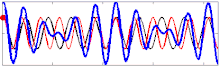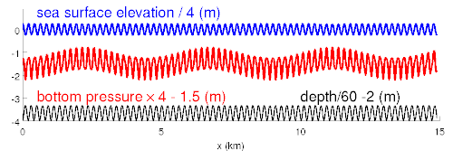 Що стосується сейсмічних та акустичних хвиль, то рух океанських хвиль у глибокій воді найвищого порядку, еквівалентний тиску, що застосовується на морську поверхню.[5] Цей тиск майже дорівнює густині води, менший за орбітальну швидкость хвилі в квадраті. Через цю площу значення мають не амплітуда окремих хвиль (червоні та чорні лінії на малюнках), а амплітуда суми, групи хвиль (синя лінія у фігурах).