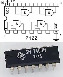 Мікросхема в DIP-корпусі з 14 виводами, праворуч - представник серії, що містить чотири елементи І-НЕ, кожен з двома входами і одним виходом. Два додаткових виводи з'єднуються з джерелом живлення (+5 В) і землею. Ця мікросхема має вітчизняний аналог — К155ЛА3 з аналогічним розташуванням виводів.