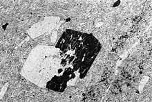 Фотомікрографія порфіритно-афанітської фельсичної породи з середнього еоцену в горах Блакитного хребта Вірджинії. Флакокристалічні плагіоклази (білі) і фенокристи рогової обманки (темні, перерощені плагіоклазом) встановлюються в тонкій матриці плагіоклазних планок, що відображають структуру потоку.