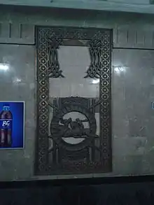 Стіни переходів і вестибюлів, колони оздоблені рожевим Газганським мармуром; підлога викладена сірими і чорними гранітними плитами. Прямокутний платформовий зал перекрито ребристими плитами, що підтримується двома рядами колон з розширеними ригелями у вигляді арок, оформлених різьбленням по ганчу (А. Султанов). Ригелі-арки служать також карнизом для прихованих в них світильників, що освітлюють білі конструкції стелі. Спочатку на колійних стінах, оздоблених червоним Горохівським мармуром, геральдичними мідними вставками і художнім панно, були показані бойові та трудові подвиги комсомолу (худ. Б. Джалалов, Р. Немирівський). Станом на жовтень 2017 мідні барельєфи встановлені, але деякі частини вирізані.