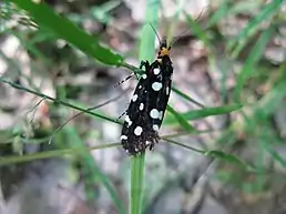 Це великі молі (розмах крил 25–33 мм). Передні крила чорні з 8 великими та кількома меншими білими крапками. Задні крила темні і мають акуратну білу облямівку. Голова яскравого рудого забарвлення.