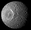 Мімас на фотографії, зробленій з «Кассіні». Добре помітна яйцеподібна форма супутника