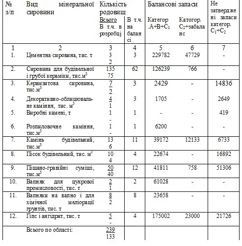 Будівельні організації, підприємства та приватні особи в області можуть повністю забезпечуватись всіма видами сировини за рахунок розвіданих власних мінеральних ресурсів за винятком розпиловочного каміння, виробних каменів та буто-щебеневої продукції.