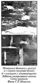 Склад мінеральних домішок вугілля вивчають фізичними методами – мікроскопічним, рентгеноскопічним і радіоізотопним аналізом та методом низькотемпературного озолення вугілля у кисневій плазмі при т-рі 100-150 °С.