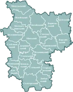 Жодино Березино • Борисов • Воложин • Вілейка • Дзержинськ • Заславль • Клецьк • Копиль • Крупки • Логойськ • Любань • Мар'їна Горка • Молодечно • Мядель • Несвіж • Слуцьк • Смолевичі • Солігорськ • Старі Дороги • Стовбці • Узда • Фаніполь • Червень | |