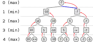 Алгоритм оцінює кожен вузол за допомогою евристичних функцій оцінки, отримані значення показано на малюнку. Ходи, де максимізуючий гравець виграє, оцінені як додатна нескінченність, в той час як кроки, які приведуть до перемоги мінімізуючого гравця, оцінені як від'ємна нескінченність. На рівні 3 алгоритм буде вибирати, для кожного вузла, найменше зі значень його дочірніх вузлів, і призначить це значення тому ж вузлу (наприклад, вузол зліва буде вибирати мінімальне з "10" і "+ ∞", тому призначить собі значення "10"). Наступний крок, на рівні 2, полягає у виборі найбільшого значення для кожного вузла серед його дочірніх вузлів. Знову ж таки, кожне значення присвоюється кожному батьківському вузлу. Алгоритм продовжує оцінки максимального і мінімального значень дочірніх вузлів по черзі, аж поки не досягне кореневого вузла, де він вибирає хід з найбільшим значенням (представлено на малюнку синьою стрілкою). Це крок, який гравець повинен зробити для того, щоб звести до мінімуму максимально можливої втрати.