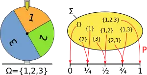 Наприклад, нехай трьом елементам 1, 2 і 3, відповідно приписано ймовірності 1/4, 1/4 і 1/2. Тоді, множині {1, 3} буде присвоєна ймовірність 1/4 + 1/2 = 3/4, як відображено на діаграмі справа.