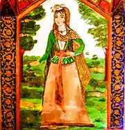 Жіночі портрети на теми поем Нізамі Гянджеві[11][27] (праворуч Ширін з «Хосров і Ширін»)[28] в інтер'єрі будинку Шекіханових ув Шекі. За словами Міклашевської, шати жіночих персонажів у розписах цього будинку схожі з капелюшком і кроєм сукні «Танцівниці» Ерівані | ||||||||||