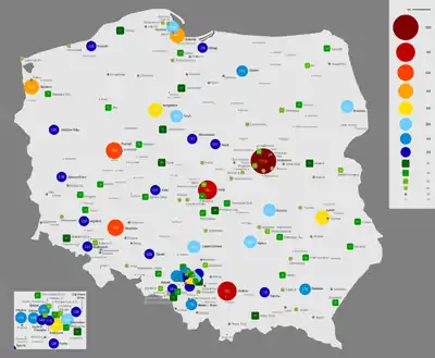 - 6 міст від 250 000 do 499 999: Гданськ, Щецин, Бидгощ, Люблін, Білосток, Катовиці