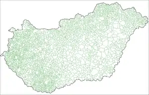 Станом на 1 липня 2009 року в Угорщині є 3152 населених пункти. З них 328 міста (угорською: város, множина: városok) та 2824 села (угорською: község, множина: községek). Село може отримати статус міста рішенням Президента. Столиця країни Будапешт має спеціальний статус і не належить до жодної адміністративної одиниці. Втім 23 міста мають статус міста-медьє (megyei jogú város — міста з правами медьє).