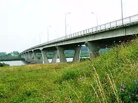 Міст залізобетонний консольно-балковий. Схема розбивки на прольоти: 2 х 33,0 + 43,5 + 5 х 54 + 43,5 + 2 х 33 м[1]. Руслові прольоти перекриті балками-підвісками, котрі опираються на консолі, закладені в проміжних опорах. Бічні прольоти перекриті залізобетонними балками. Опори V-подібної форми виготовлені з монолітного залізобетону, на пальовій основі. Висота проїжджої частини над рівнем води — 17,3 м. Загальна довжина мосту складає 494 м, ширина — 13 м[6][1].