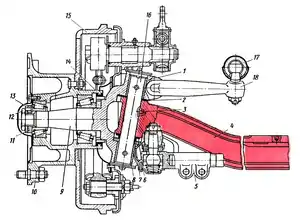 Комбінований міст виконує функції ведучого та керованого мостів. До півосьового кожуха комбінованого моста прикріплюють кульову опору, на котрій наявні шворневі пальці. На останніх встановлюють поворотні кулаки (цапфи). Всередині кульових опор та поворотних кулаків знаходиться карданний шарнір (рівних кутових швидкостей), через який здійснюється привод на ведучі та керовані колеса.