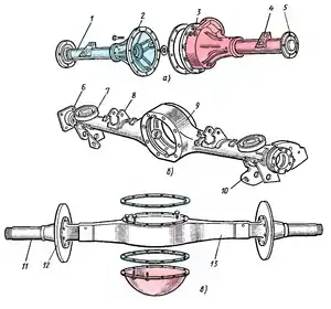 Картер роз'ємного ведучого моста (див. малюнок) зазвичай відливають з ковкого чавуну, й він складається з двох з'єднаних між собою частин 2 і 3, з роз'ємом у поздовжній вертикальній площині. Обидві частини картера мають горловини, у які запресовані та закріплені сталеві трубчаті кожухи півосей 1. До них приварені опорні площини ресор 4 та фланці 5 для кріплення опорних дисків колісних гальмівних механізмів. Роз'ємні ведучі мости застосовуються на легкових автомобілях, вантажних автомобілях малої та середньої вантажності.