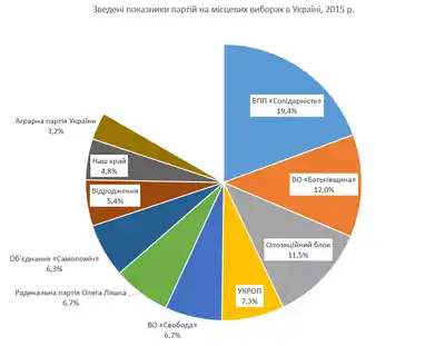 - ПІДСУМКИ МІСЦЕВИХ ВИБОРІВ-2015: РЕЗУЛЬТАТИ ПАРТІЙ / Комітет виборців України, 11-12 листопада 2015 Архівовано 14 листопада 2015 у Wayback Machine. Архівовано 12.11.2015