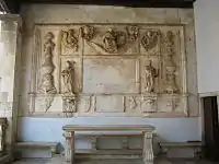 На східній стіні лоджії Флорентинець викарбував чудовий барельєф, що має майже вичерпну пластику. Барельєф заключений у прямокутні рамки, всередині яких є декілька прямокутників менших за розміром із зображенням алегоричних образів, з гербами, написами та іншими декораціями. У центральному прямокутнику верхнього ряду виділяється алегоричний образ Справедливості із вагами. У менших прямокутниках, праворуч і ліворуч зображені янголи із написами у руках, присвячені справедливості. У центральному прямокутнику до 1932 року був першокласно викарбуваний венеціанський лев. З обох сторін його облямовують трогірські патрони, блаженний Іоанн Трогірський, який тримає у руці макет міста Трогіра і святий Ловро (Лаврентій) із вертелем, символом своєї мученицької смерті. Ліворуч і праворуч, охоплюючи два ряди прямокутників, вирізьблені два високих ренесансних канделябри, які майже можна вважати захисним знаком Ніколи Флорентинця. У нижній частині барельєфа чергуються кам'яні візерунки, герби і написи.