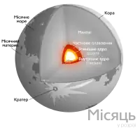 Місяць — диференційоване тіло, він має кору, мантію і ядро, які різняться за хімічним складом. Оболонка внутрішнього ядра багата залізом, вона має радіус 240 км, рідке зовнішнє ядро складається в основному з рідкого заліза і має радіус приблизно 300—330 кілометрів. Навколо ядра розташовано частково розплавлений прикордонний шар радіусом близько 480—500 кілометрів. Ця структура, як вважають, утворилася в результаті фракційної кристалізації з глобального океану магми, незабаром після утворення Місяця — 4,5 мільярда років тому. Місячна кора в середньому має товщину ≈50 км.