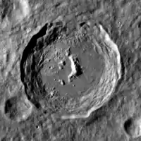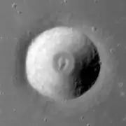 - Центральна гірка. Складена глибинними породами, що після удару відскакують догори (подібно до краплі віддачі при падінні у воду невеликого предмета[27]. Наявна у всіх свіжих кратерів розміром від 35[20] до 150–200 км та у багатьох менших. Для кратерів діаметром <10 км незвична, але зрідка трапляється навіть у 3-кілометрових. Зазвичай нижча за вал кратера, хоча є й винятки[27]. У великих кратерів може мати кілька вершин[20].