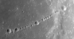 Ланцюжки кратерів Місяця зазвичай отримують назву за сусіднім кратером. Їх латинські назви включають слово Catena («ланцюг»)[118][121]. Наприклад, у кратері Менделєєв є ланцюжок Менделєєва (Catena Mendeleev).