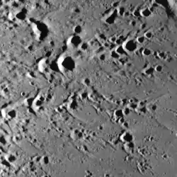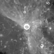 - Світлі промені, що радіально розходяться від кратера. Можуть сягати сотень кілометрів завдовжки. Частково утворені викинутою з кратера речовиною, а частково — місцевим ґрунтом, що при її падінні був викинутий на поверхню[11][35].