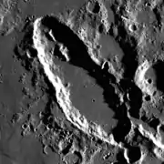 - за більшого діаметра центральна частина дна стає плоскою; абсолютний та відносний діаметр внутрішнього кільцевого хребта зростають. Це басейни з гірським кільцем (peak-ring basins)[44]. На основі альтиметричних та гравіметричних даних на Місяці ідентифіковано 16[43]–17[28] таких об'єктів; їх діаметр лежить у межах 210–580 км, а найвиразнішим представником є 320-кілометровий кратер Шредінгер[28]. У цьому ж розмірному діапазоні лежать понад 20 басейнів, у яких внутрішнє кільце не збереглося[43];