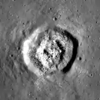 - Ореол викидів, що вкриває навколишню місцевість. Поблизу кратера — неперервний, далі — переривчастий. Має згладжений рельєф, але перетятий неглибокими радіально видовженими западинами, що поодаль від кратера плавно переходять у ланцюжки вторинних кратерів. У молодих кратерів найчастіше вирізняється збільшеною яскравістю, бо тамтешній ґрунт опинився на поверхні недавно (з часом він тьмянішає під впливом жорсткого космічного випромінювання). Проте трапляються і кратери, оточені темним ореолом. Це буває в місцевостях, де під шаром світлого ґрунту лежить темний, що при появі кратера викидається нагору[33][34].