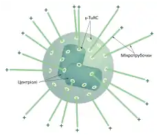 - астральні мікротрубочки (англ. astral microtubule, A-MT), плюс-кінці яких йдуть до цитоскелета, радіально від полюса, допомагаючи закріпитися веретену поділу у клітині та виконуючи роль під час цитокінезу;