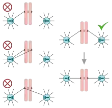 Правильний процес під'єднання кінетохорів до мікротрубочок від різних полюсів забезпечується методом проб і помилок, таке правильне з'єднання має велике тягове зусилля: хромосому тягнуть кінезинові білки до різних полюсів клітини і лише з'єднання в області центромери не дає сестринським хроматидам розійтися. Таке з'єднання є стабільним. При неправильному контакті, наприклад контакті обох кінетохорів з мікротрубочками одного полюсу, цього тягового зусилля не виникає, і таке з'єднання є нестабільним і швидко руйнується, тоді кінетохор знову з'єднується з мікротрубочками і такий процес продовжується доти, доки не досягнеться стабільне з'єднання. Причина стабільності з'єднання в основному лежить в кіназній активності білку Aurora B, який фосфорилює комплекс приєднання мікротрубочок до веретена поділу, що призводить до розриву контакту. Одна з моделей, яка пояснює цей механізм, називається «собача прив'язь» і полягає в тому, що Aurora B приєднана до внутрішнього кінетохору за допомогою білку INCENP[9] і може фосфорилювати лише ті білки, що знаходяться в радіусі рухливості INCENP, на кшталт прив'язі собаки[10]. Таким чином, при неправильному контакті напруги між кінетохором і мікротрубочками немає і плюс-кінці та білкові комплекси зовнішнього кінетохору, що контактують з мікротрубочок, лежать в зоні досягнення Aurora B, що їх фосфорилює та руйнує контакт. При контакті хромосоми з мікротрубочками обох полюсів виникає тягова сила, відстань між внутрішнім і зовнішнім кінетохором збільшується, Aurora B вже не досягає до комплексу з'єднання з мікротрубочками і нездатний його фосфорилювати. Тому такий контакт залишається.[10]