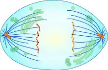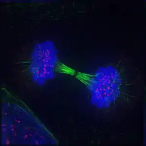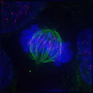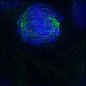 Рання анафаза мітозу в клітині нирки тритона (оптична мікрофотографія, імунофлюоресценція). Мікротрубочки зелені, хромосоми блакитні.