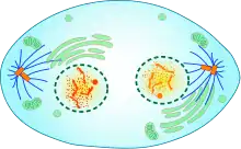 Інактивація комплексу ЦЗК1–циклін B ініціює формування ядерної мембрани. Частини внутрішньої ядерної мембрани повертаються від ендоплазматичного ретикулуму і з'єднуються з хроматином. При цьому хроматин також зазнає певних змін; так, від нього від'єднується кіназа Aurora B (див. п. мітотична хромосома). Злиття частин ядерної мембрани відбувається одночасно з утворенням ядерних пор, таким чином уникається формування закритого ядра без пор.[3]