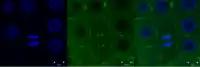 Конфокальна мікрофотографія мітотичних мікротрубочок (забарвлені зеленим за допомогою анти-тубуліну, кон'югованого з барвником) та ядер (блакитні). Клітини меристеми головних коренів чотириденних проростків Arabidopsis thaliana (Col-0). Довжина масштабної лінійки — 5 мкм.