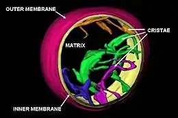 Мітохондрія оточена внутрішньою і зовнішньою мембранами, складеними з подвійного шару фосфоліпідів і білків. Ці дві мембрани схожі, проте, мають різні властивості. Зовнішня мембрана товщиною 7 нм гладенька, вона не утворює ніяких складок і виростів. Внутрішня мембрана утворює численні складки, спрямовані в порожнину мітохондрії, товщиною 7 нм. Через цю двомембранну організацію мітохондрія фізично розділена на 5 відділів. Це зовнішня мембрана, міжмембранний простір (простір між зовнішньою і внутрішньою мембранами, 10 нм), внутрішня мембрана, кристи (сформовані складками внутрішньої мембрани) і матрикс (простір в межах внутрішньої мембрани). Мітохондрія має розміри від 1 до 10 мікрон (μм).