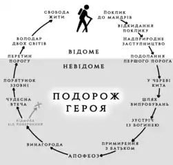 У виправі герой стикається з проблемою, що спонукає його почати пошуки її вирішення. Герой опиняється на межі відомого, звичайного світу, з невідомим, і повинен пройти випробування, щоб цю межу подолати. На етапі ініціації він проявляє такі якості, як сила, розум, долає противників і досягає мети. Коли проблема вже вирішена, героєві ще належить повернутися до свого світу. На етапі повернення він долає останніх супротивників, рятується від небезпек, що загрожують йому знову перетнути кордон незвичайного світу зі звичайним. Врешті він повертається у перетворений своїми діями світ, або демонструє власні нові якості[14][15].