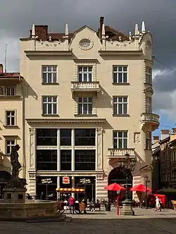 - Торговий дім Ціпперів на розі площі Ринок, 32 і вулиці Шевської у стилі модернізованого ренесансу і бароко. Збудований фірмою Едмунда Жиховича у 1912 році[25][26].