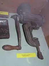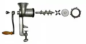 Механічні м'ясорубки використовують для подачі м'яса до ножів обертовий шнек, що приводиться в рух ручною корбою. Зазвичай кріпиться до краю столу за допомогою вбудованої струбцини.