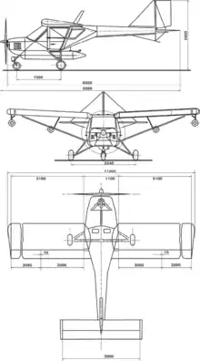 - Компонування: класична, підвідкосний високоплан з силовою установкою, що тягне, триопорним шасі і носовим колесом.