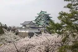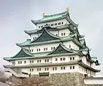 Нагойський замок — один із символів Нагої. До появи хмарочосів блиск золотих прикрас його даху виднівся за десятки кілометрів від самого міста. Замок постраждав під час Другої світової війни, але був відновлений мешканцями Нагої. |