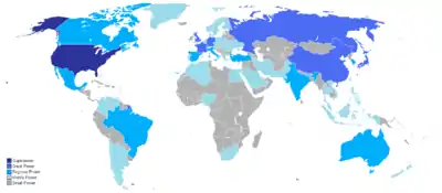 Термін вперше використаний для опису країн з більшим статусом, ніж у великих держав, приблизно в 1944 р., але отримав особливий сенс у зв'язку з новими геополітичними реаліями після Другої світової війни, тому що Велика Британія, Сполучені Штати і Радянський Союз зарекомендували себе державами, здатними здійснювати великий вплив на світову політику та військове панування. Термін в його нинішньому політичному сенсі придуманий голландсько-американським геостратегом Ніколасом Спайкменом в серії лекцій в 1943 р. про потенційну форму нового післявоєнного світового порядку. Це сформувало основу для книги Географія миру (англ. The Geography of the Peace), в якій йдеться, насамперед, про неперевершене морське світове панування Британської імперії та Сполучених Штатів, як важливе для миру і процвітання у світі.