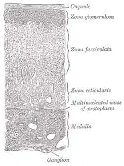 Надниркова залоза складається з двох структур — кіркової речовини і мозкової речовини. Мозкова речовина служить основним джерелом катехоламінових гормонів організму — адреналіну і норадреналіну. Деякі з клітин кіркової речовини належать до системи «гіпоталамус — гіпофіз — кора надниркової залози» та синтезують кортикостероїдів. Кіркова речовина темно-бурого кольору, виділяє життєво важливі гормони: мінералокортикоїди та статеві гормони.