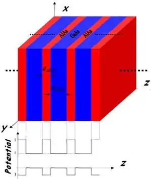 Напівпровідникові надґратки із квантовими потенціальними ямами (КЯ), складаються із періодично чередованих шарів напівпровідників з різною шириною забороненої зони. В таких структурах шари напівпровідника із вузькою забороненою зоною мають товщини, співставні з де-Бройлівською довжиною хвилі носіїв заряду в кристалі , де - редукована стала Планка, - ефективна маса носіїв заряду, - швидкість. Тому в кожному такому шарі реалізуються умови квантового розмірного ефекту.
