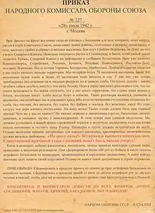 Наказ народного комісара оборони Союзу РСР № 227 від 28 липня 1942 року (отримав неофіційну назву «Ні кроку назад!»). Виданий у зв'язку з різким загостренням стратегічної обстановки на радянсько-німецькому фронті, коли війська Червоної армії після поразки в Харківській операції 1942 року, невдалих боїв у районі Воронежа, на Дону та на Донбасі з величезними втратами відступали до Волги і Північного Кавказу. Німці захопили густонаселені й найбільш розвинені промислові і сільсько-господарські райони СРСР. У документі констатувалося: на окупованій території залишилися 70 млн. радянських людей і величезні стратегічні ресурси, СРСР втратив перевагу над Німеччиною в людських резервах і запасах хліба, подальший відступ загрожував державі загибеллю. Наказ мав на меті ліквідувати пораженські настрої у військах, підвищити рівень дисципліни й відповідальності командного складу. Йосип Сталін вимагав наведення в армії «найсуворішого порядку і залізної дисципліни», знімати з посад і судити командирів будь-якого рангу, які допустили відступ військ без наказу вищого командира. Для кожного військовослужбовця оголошувалася вимога — ні кроку назад без наказу командування. Панікерів і боягузів наказувалося знищувати на місці. Передбачалося сформувати в межах фронту 1—3 штрафні батальйони по 800 осіб, а в межах армії — 5—10 штрафних рот по 150—200 осіб у кожній; 3—5 загороджувальних загонів (до 200 осіб у кожному), що мали не допустити несанкціонованого відходу частин із займаних позицій. Командування фронтів зобов'язувалося «ліквідувати відступальні настрої у військах», а також знімати з постів і направляти в Ставку Верховного головнокомандування для притягнення до військового суду командирів, які дозволили самовільний відступ з позицій без наказу командуючого фронту. Аналогічні дії армійського командування передбачалися стосовно командирів та комісарів корпусів, полків і батальйонів. Подальші події показали, що заходи, здійснені відповідно до наказу, не змогли зупинити відступ радянських військ. Проте вони все ж відіграли мобілізуючу роль у наведенні дисципліни й порядку.