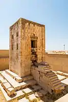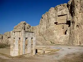 Кааба Зороастра, кубічна конструкція на передньому плані, на тлі Накш-і-Рустам