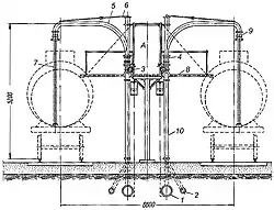 На рис. зображена двостороння естакада галерейного типу. Головною відмінною рисою її є галерея А, що йде вздовж усього фронту наливу. По галереї наливальники легко пересуваються від однієї цистерни до іншої на зручній висоті для заправки шлангів у цистерни і спостереження за ходом їх наливання.