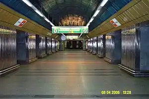 Вихід на поверхню, до однойменної площі, здійснюється через підземний вестибюль, з'єднаний з платформою довжелезним в Євросоюзі ескалатором (довжиною 87 метрів).[1]