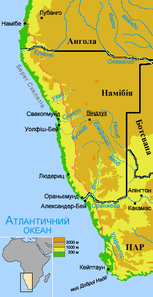 Місцевість повільно підіймається на схід від океанського берега до рівня близько 900 м біля підніжжя континентального плато. Подекуди над пустелею здіймаються скелясті гори з крутими схилами, крізь які на півночі декілька річок прорізують глибокі ущелини зі стрімчастими стінами.