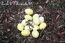 Статева зрілість настає наприкінці другого або третього року життя. До гніздування приступає в теплу пору року, в проміжку між серпнем і січнем залежно від широти. Для самців характерна одночасна полігінія, для самок — послідовна поліандрія. На практиці це виглядає наступним чином: самка по черзі переміщається від одного самця до іншого, злучається з ними і відкладає 5-10 яєць в невелику лунку, викладену гілочками і сухий рослинністю. З іншого боку, самець невідлучно залишається біля гнізда, додає в нього будівельний матеріал, і злучається з декількома самками. Всі яйця додаються в одне і те саме гніздо, і внаслідок в ньому може зібратися до 80 яєць, залишених 12-ю самками (найчастіше кількість яєць варіює від 13 до 30). Яйця спочатку пофарбовані в жовтувато-зелений колір, проте до закінчення насиджування стають блідо-кремовими. Розміри яєць: (132 х 90) мм, вага близько 600 г.[6] Повна турбота про потомство лягає на плечі самця, який приступає до насиджування через 2-8 днів після кладки першого яйця. Тривалість насиджування 29-43 днів. Незважаючи на те, що між відкладання першого і останнього яйця найчастіше проходить до двох тижнів, всі пташенята з'являються на світ протягом 36 годин[14].Вже у віці 3-х місяців молоді птахи досягають зросту своїх батьків[6].
