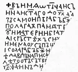 въ имѧ ѡтьца и съина и с҃таго дѹха азъ самоип(л)ь рабъ б҃жи полагаѫ памѧть ѡтьцѹ и матєри и братѹ на кръстѣхъ сихъ· имєна ѹсъпъшихъ никола рабъ б҃жи … ѣ давдъ написа … въ лѣто отъ сътворєния мирѹ ѕ҃· фа҃· инъдикта ѕ҃·