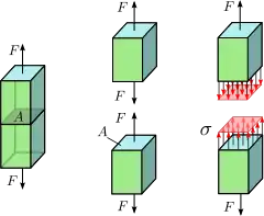 - Нормальне напруження (напруження розтягу-стиску) — зусилля прикладене до одиниці площі перерізу зразка, спрямоване по нормалі до перерізу (позначається ).