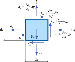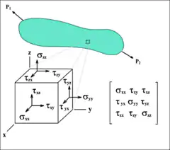 Якщо окіл точки P (рис.2) обмежити шістьма взаємно перпендикулярними площинами і отриманий елементарний паралелепіпед зорієнтувати ребрами паралельно осям декартових координат, то на кожній із граней паралелепіпеда будуть діяти відповідні напруження. Повні напруження у площинах xy, xz та yz можна розкласти по напрямах, паралельних до осей декартових координат (рис.5). Отримані дев'ять компонентів напружень повністю визначають напружений стан і утворюють тензор механічних напружень (тензор напружень Коші).